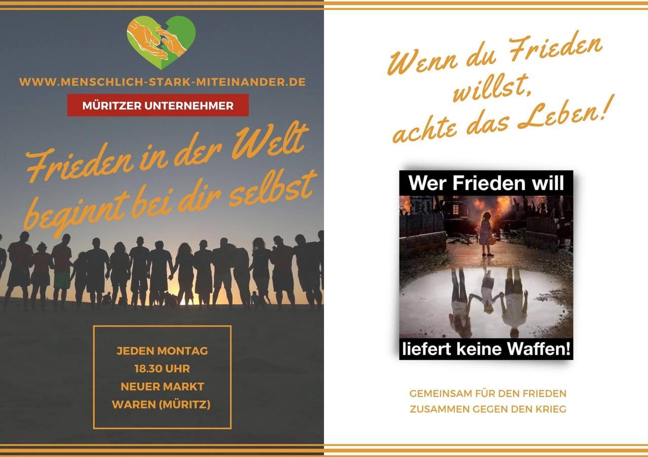 Die Initiative Menschlich-Stark-Miteinander organisiert die Kundgebungen, die jeden Montag um 18:30 Uhr auf dem Neuen Markt in Waren (Müritz) stattfinden. Dabei geht es immer um aktuelle Themen der Zeit. Nach der Entscheidung der Bundesregierung, nun auch Panzer in den Ukraine-Krieg zu entsenden, steht für die Menschen der Initiative ein Thema ganz klar im Fokus: FRIEDEN. In den vergangenen Jahren wurden immer wieder Rote Linien gezogen, die von den Entscheidungsträgern nur kurze Zeit später überschritten wurden. Darum laden wir alle friedensliebenden Menschen unserer Region ein, sich am Samstag, den 28.01.2023 unserer Menschenkette unter dem Motto: „Gemeinsam für den Frieden“ anzuschließen. Treffpunkt ist um 10:00 Uhr am Jugendzentrum JOO!, Zum Amtsbrink 16, Waren (Müritz). Wir werden entlang des Schweriner Damms, ohne Beeinträchtigung des Straßenverkehrs, zusammen gegen eine weitere Eskalation des Ukraine-Krieges, gegen weitere Waffenlieferungen in Kriegsgebiete und für die Aufnahme von Friedensverhandlungen stehen. Ab Montag, den 30.01.2023 um 18:30 Uhr werden wir wöchentlich starke Botschaften des Friedens senden. Der Frieden in der Welt beginnt bei jedem selbst. Darum rufen wir als Initiative Menschlich-Stark-Miteinander alle Menschen auf, sich unserem Weg zum Frieden anzuschließen. Mit freundlichen Grüßen Menschlich-Stark-Miteinander