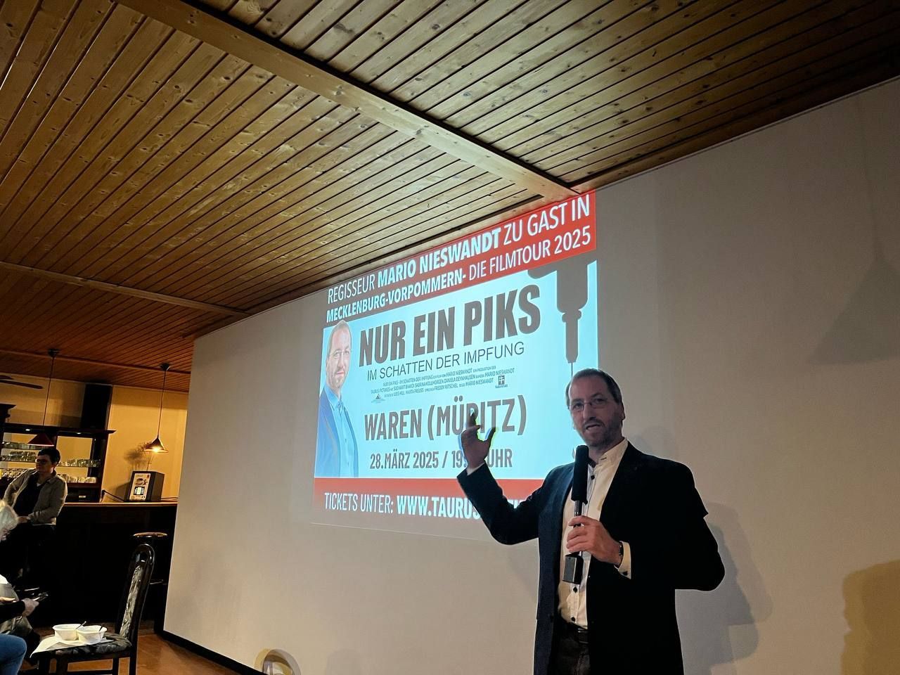 Auf Einladung der Initiative Menschlich Stark Miteinander fanden sich am 28.03.2025 mehr als 130 Menschen in der Gaststätte „Uwe“ in Warenshof ein, um gemeinsam der Vorführung des Films „Nur ein Piks - Im Schatten der Impfung“ beizuwohnen. Der beeindruckende Film wühlt auf, bedeutsamer ist aber vielmehr, dass die 75 Minuten aufklären und Betroffenen eine Stimme geben, die ansonsten kein Gehör finden. Unter den Gästen waren auch der Regisseur des Films Mario Nieswandt und der mutige Arzt Dr. Joachim Bennien aus Dierhagen. Beide berichteten über ihre Erfahrungen und den Umgang mit dieser menschenfeindlichen Zeit. Jedoch spürten alle Beteiligten die Kraft und den Zusammenhalt der Gemeinschaft und die daraus resultierende Zuversicht. Vielen Dank für einen gelungenen Abend.