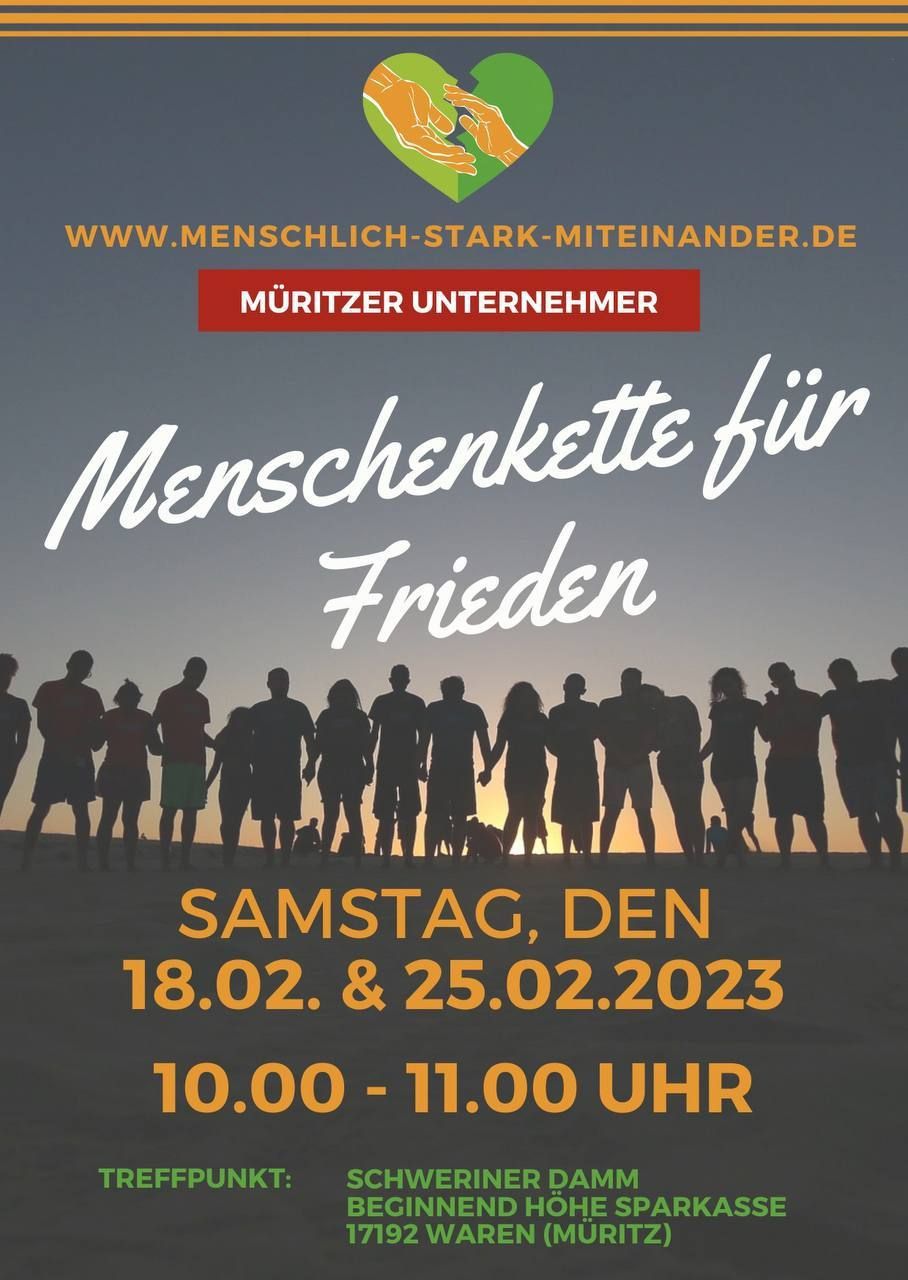 Die Initiative Menschlich-Stark-Miteinander lädt alle friedensliebenden Menschen unserer Region ein, sich am Samstag, den 18.02.2023 unserer Menschenkette für den Frieden anzuschließen und gemeinsam ein Zeichen zu setzen. Startpunkt ist um 10:00 Uhr am Schweriner Damm in Höhe der Müritz-Sparkasse, Friedensstraße 9-10, 17192 Waren (Müritz). Wir werden entlang des Schweriner Damms, ohne Beeinträchtigung des Straßenverkehrs, zusammen gegen eine weitere Eskalation des Ukraine-Krieges, gegen weitere Waffenlieferungen in Kriegsgebiete und für die Aufnahme von Friedensverhandlungen stehen. Die erste Menschenkette in Mecklenburg-Vorpommern am 28.01.2023 in Waren (Müritz) hat zahlreiche weitere Städte zu kraftvollen Botschaften des Friedens inspiriert. Trotzdem sind unsere Befürchtungen eingetreten, dass nach Waffen und Panzern nun Kampfjets gefordert werden. Auch die Diskussionen um die Wiedereinführung der Wehrpflicht werden lauter. Noch versichert die Bundesregierung unsere Söhne nicht in das Kriegsgebiet zu entsenden, aber zu oft wurden in letzter Zeit rote Linien überschritten. Darum werden wir sowohl am 18.02.2023 als auch am 25.02.2023 , wenn sich der Beginn des Krieges jährt, die bundesweiten Aktionen mit einer weiteren Menschenkette unterstützen. Gedenkend der unvorstellbaren Not und des Elends durch den 2. Weltkrieg sollte es für unser Land eine Pflicht sein, eine vermittelnde und friedensbewahrende Position einzunehmen. Mit freundlichen Grüßen Menschlich-Stark-Miteinander