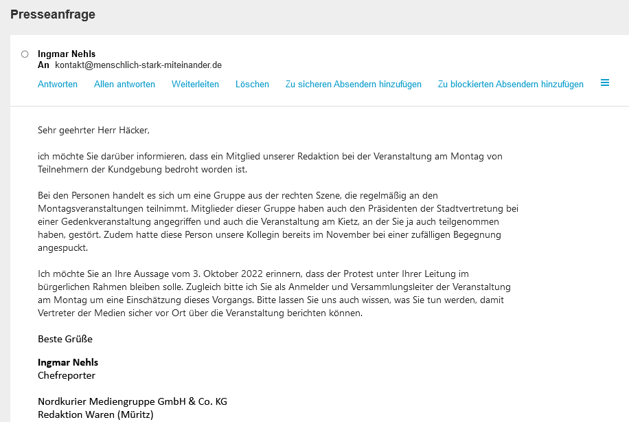 Eine unvoreingenommene Berichterstattung muss möglich sein – der Fauxpas vom 02./03.01.2023 darf sich nicht wiederholen. Die Initiative Menschlich-Stark-Miteinander besteht bekanntermaßen aus untadeligen Menschen unserer Region, trotzdem werden wir durch Ihre Berichterstattung in unfassbare „Ecken“ verortet. Es gibt Menschen in Waren, die noch nie ein Wort mit mir gewechselt haben, sich aber vor mir fürchten. Sie kennen mich lediglich aus der Presse und ich bin sicher der Letzte, vor dem sich jemand fürchten muss.